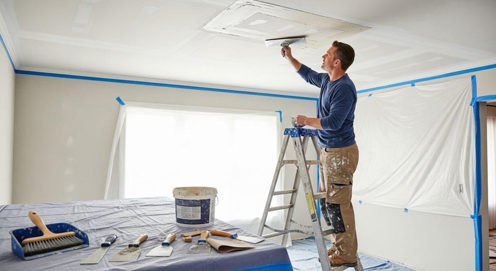 Identifying and repairing the source of ceiling damage before restoring the surface